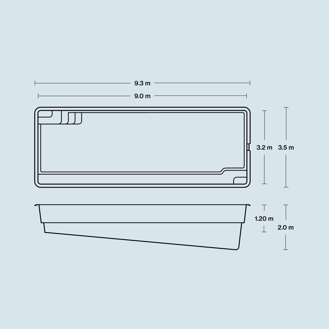 The perfect blend of clever design and style, ‘The Taigen’ is Summertime Pools’ ideal all-rounder. Available in 5m and 9m sizes, it features a long bench seat and carefully arranged steps for easy access, making it an ideal choice for children, parties, and fitness enthusiasts. The Taigen’s sleek design combines contemporary pool design with function – the smart choice for maximising backyard enjoyment.