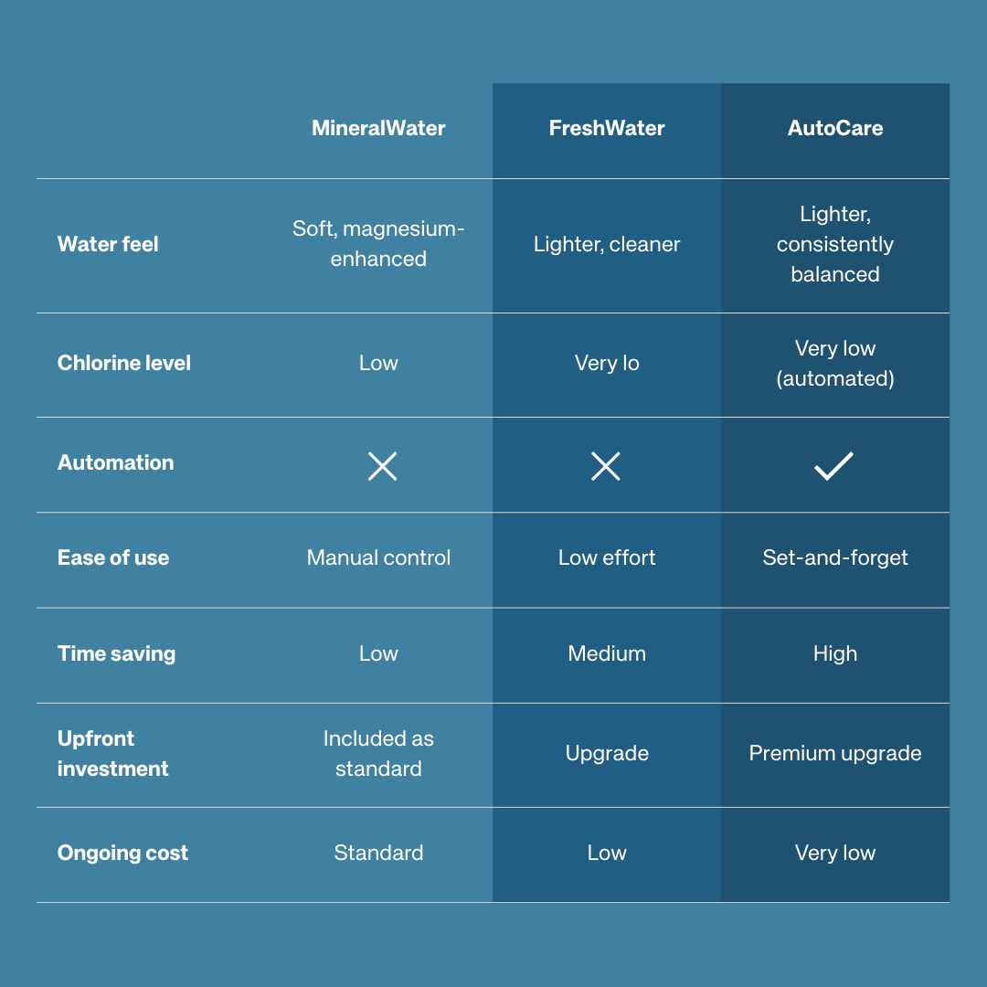 However, FreshWater and AutoCare operate with much lower chlorine levels and use UV sanitisation to reduce irritants, which can also make a noticeable difference for people sensitive to traditional pools.