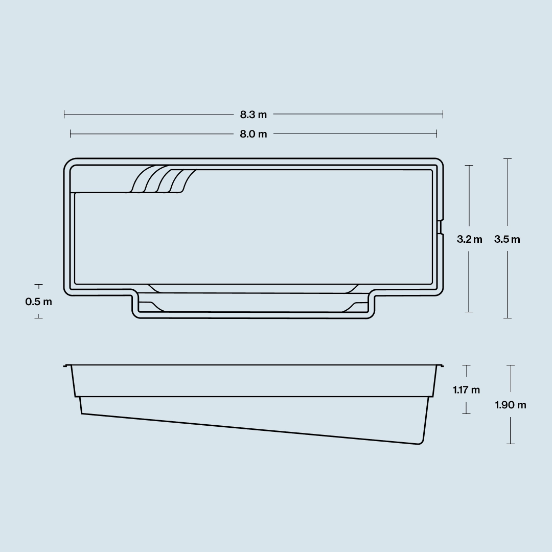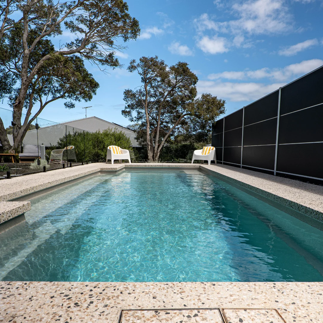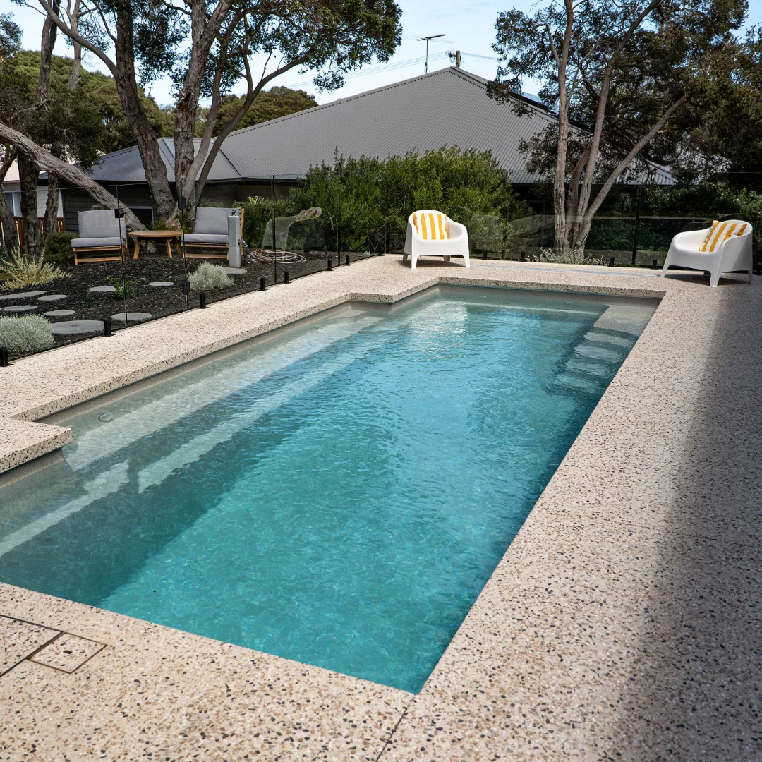 Splash out in style with ‘The Lorne’, the perfect pool design for contemporary backyards. The Lorne seamlessly blends style with practicality to fit your lifestyle. Available in 6m, 7m, and 8m lengths, this Australian-made fibreglass pool offers a spacious bench seat, perfect for lounging and socialising. Easily accessible entry steps lead into a range of depths (1.1m to 1.9m), making it a versatile pool that’s ideal for small gatherings, family fun, or quiet retreats. The Lorne turns even the smallest backyard into a luxurious retreat with a compact, contemporary pool design.